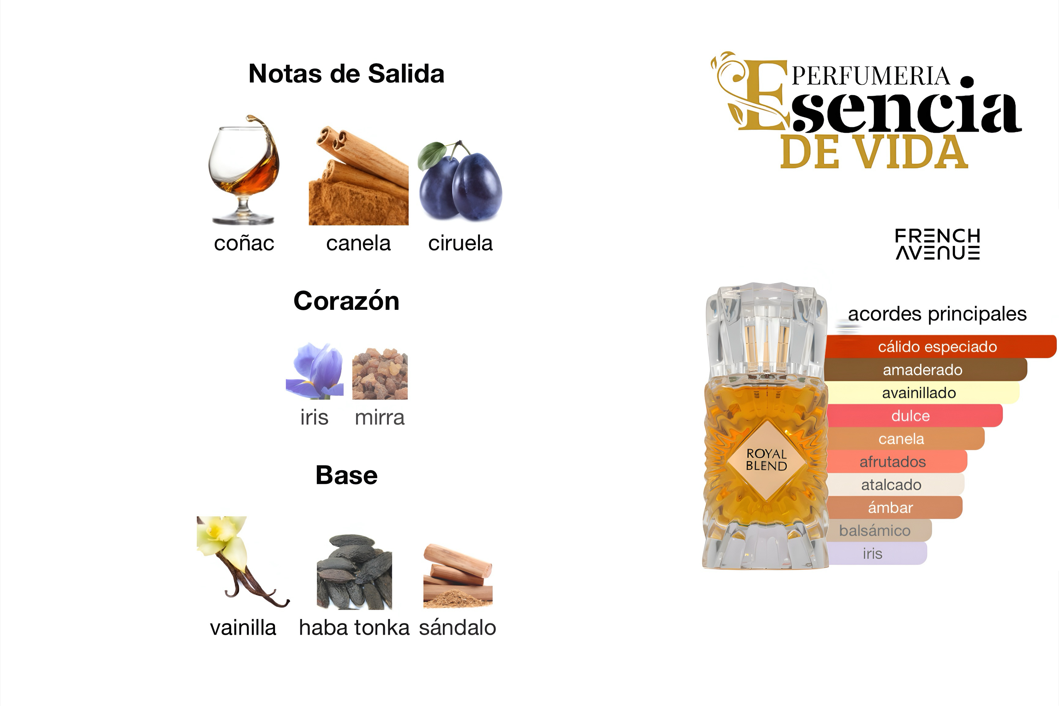 Royal Blend de French Avenue es una fragancia de la familia olfativa Amaderada Aromática para Hombres y Mujeres. Royal Blend se lanzó en 2023. Las Notas de Salida son coñac, canela y ciruela; las Notas de Corazón son iris y mirra; las Notas de Fondo son vainilla, haba tonka y sándalo.