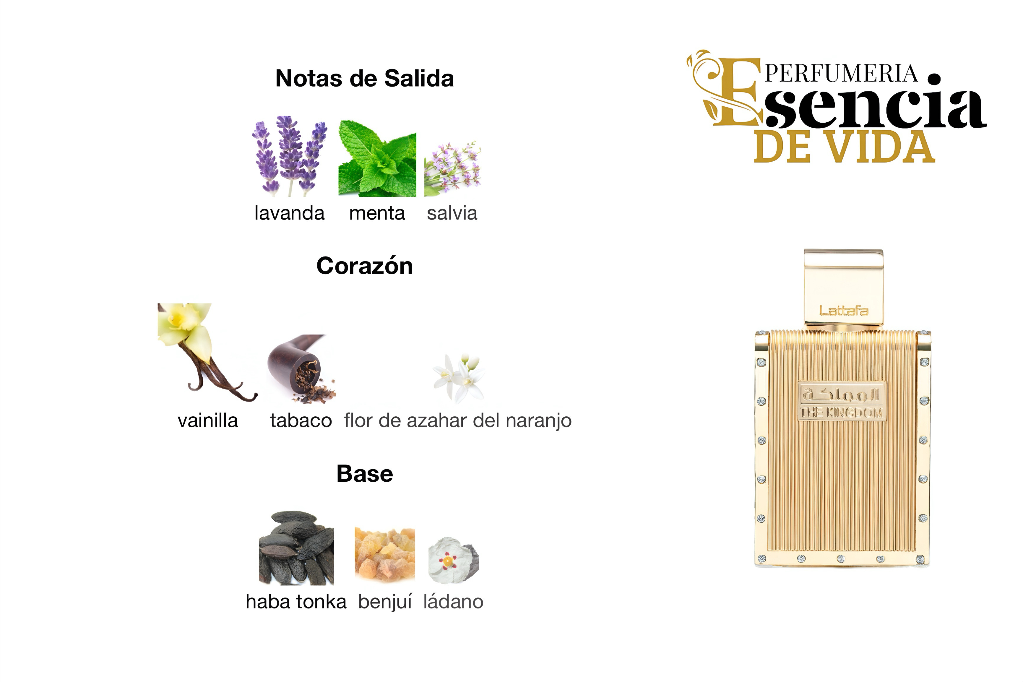 The Kingdom es una fragancia masculina de la familia olfativa Aromática que combina frescura, dulzura y profundidad en una composición refinada y moderna. La apertura es vibrante y energizante, con la frescura herbal de la lavanda, la menta y la salvia, que crean un inicio aromático y revitalizante. En el corazón, se despliega una combinación cálida y cautivadora de vainilla dulce, el carácter robusto del tabaco y un toque floral sofisticado de flor de azahar del naranjo. Finalmente, la base ofrece una profundidad envolvente con la calidez resinosa del benjuí, la suavidad de la haba tonka y el carácter ahumado del ládano.